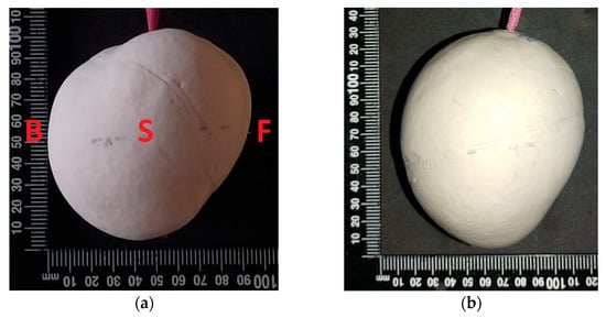 Fruit phantoms used in trials. (a) 378 g; (b) 512 g; (c) 636 g; and (d) 836 g. Fruit faces were referred to as Front (F), Back (B), and Side (S), as labelled in panel (a).