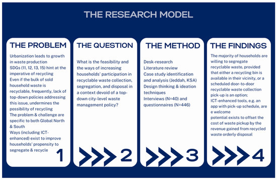 To address this complex question, in line with the research model featured in Figure 1, the design thinking approach [3] was employed to identify the determinants of the level of engagement in solid recyclable waste collection, segregation, and orderly disposal among households. The empirical focus of the study was directed at the city of Jeddah, KSA’s second largest city, which is currently experiencing rapid socio-economic growth and development [4]. In Jeddah, no household recyclable waste collection regime has been put in place. In its place, there is only a mechanical waste segregation process conducted at the municipal landfill. The results of this study suggest the following: First, there is great potential in engaging citizens in waste segregation and disposal. Second, the potential financial gains from segregating, collecting, and recycling solid waste can offset the cost of its collection and orderly disposal.
