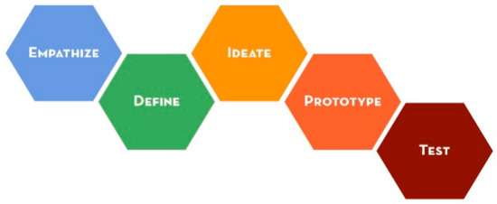 Design thinking starts with abstract information then passes through several cognitive processes to develop a greater understanding of the problem and refined solutions. As such, the process is frequently seen as chaotic [68]; thus, it is sometimes perceived as ambiguous by the business sector. For this reason, it is essential that the perceived chaos of design thinking is organized and streamlined precisely to allow the business sector to use the method as a tool for problem solving. Several ways of streamlining the design thinking process have been proposed in the literature [69]. In this study, the Stanford Design School’s design thinking process, along with its specific stages, has been adopted (see Figure 2 for details) [70]. An elaboration of how the design thinking process is depicted can be found in the empirical study section.