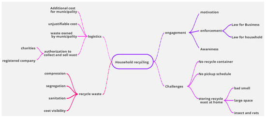 As for surveys, they are a data collection tool that targets specific groups of people relevant to the context of a given study. A survey is mainly used to collect large amounts of data in a short period of time; specifically, this has been made easier with the help of online survey tools such as Survey Monkey and Google Survey. Surveys are widely considered as an objective research tool [75] as long as specific consideration has been given to survey design, sample size, response error rate, and statistical analysis [74]. Surveys are commonly used to capture the opinions of large audiences through asking questions. For the purposes of this study, the empathize phase consisted of interviews (insights from domain experts; see Table 1) and surveys (insights from households; see Table 2). To understand the overall process of recyclable waste collection dynamics, including the stakeholders and the regulatory framework, at the early stage of this study, semi-structured interviews were conducted with experts, i.e., managers and local government representatives who are engaged in and knowledgeable about the specificities of the recycling strategy in Jeddah. Accordingly, three interviews were conducted with individuals directly involved in the process of solid waste management in Jeddah. The interviewees were asked a set of similar questions. Emphasis was placed on the research team’s need to understand the process and gain a thorough insight into the existing practices, challenges, and unexplored opportunities. By asking the interviewees about their suggestions, outstanding remarks, and ideas, the research team was able to obtain an initial approximation of what some users consider useful and efficient. Table 1 illustrates the interviews conducted with the domain experts.