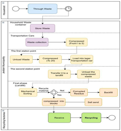 The main key factors included engagement, the challenges that need to be addressed, logistics, and action taken. The BPMN, in turn, was used to visualize the recyclable waste journey, which facilitates the further scoping of the problem in the current context. Figure 4 depicts the sequence of activities in the recycled waste journey from households in Jeddah. As for the business process model in BPMN, the process starts by collecting recyclable waste from the neighborhood’s container via municipal transport cars. Then, the waste is discharged and compressed into 20 times less volume, which is the first stage of the process. Subsequently, it is transported and delivered to the landfill by larger cars, and the compressed waste dump is considered the second stage of the process. In the last stage, waste is divided through being mechanically sorted into two parts. In the process of mechanical sorting, waste is placed on a conveyor belt that passes through several stages. The first stage involves paper blowing (for collecting paper), followed by magnetization (for collecting minerals), and the waste that reaches the end of the belt consists of materials that have no value and are converted to backfill—first as damaged remains that are filled in, and secondly, as materials compacted into blocks that can be sold.