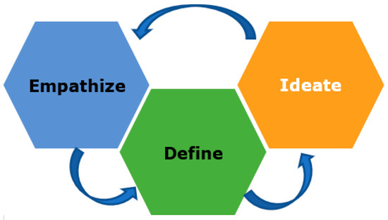 Over the years, design thinking has consolidated itself as a human-centric method that fosters and values creative engagement and collaboration. As a method, design thinking prioritizes the needs of users and places them at the center of a product (be it a merchandise or a service) reframing strategy. This approach frequently leads to new, outside-of-the-box solutions [57]. Design thinking has established itself as the leading method applied to examine and explore inter- and multidisciplinary problems specific not only to engineering and computer science, but also, and increasingly so, to social research, including so-called wicked problems pertaining to the domain of public policy [60,61,62,63,64].