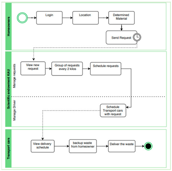 Brainstorming and voting are adopted in this phase to consolidate the different potential solutions for the problem of transporting recyclable waste. The outcome of this phase comes in the form of a design process that can be used to manage waste transportation via mobile applications. The resultant model is then illustrated using BPMN and is shown in Figure 6. BPMN was used due to its popularity as a visual modeling tool among business and technical experts [76]. The process involves three stakeholders’ homeowners who segregate recycle waste. The KAU Endowment schedules the collections and assigns the drivers who collect the recyclable waste. The process allows the Homeowner to login, request a pickup of their recyclable material, add their location, and review the delivery process. The KAU Endowment manages the delivery of the program and requests approval. The driver (in their transport car) can collect the material and review the delivery with the homeowner.