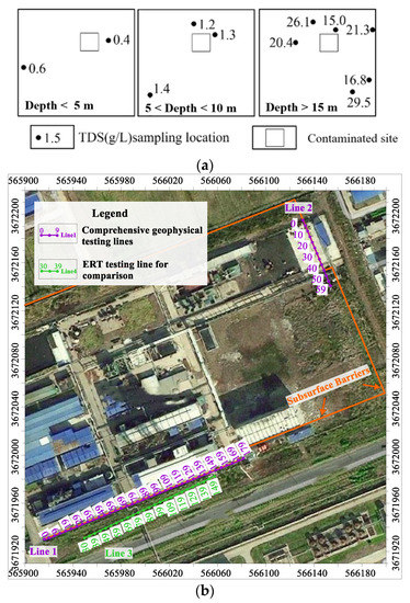 (a) TDS distribution around the contaminated site; (b) layout of the non-invasive geophysical testing line.