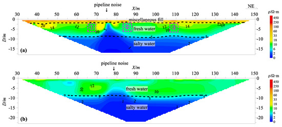 Figure 2 shows the contrast profiles of the resistivity inversion created by using the ERT on the barrier wall and outside the wall. Figure 2a shows the inversion resistivity profile of Line 1 on the barrier wall; Figure 2b shows the profile of Line 3 outside the barrier wall. The abscissa on each section is the station number, and the ordinate is the depth. It can be seen from the figure that the vertical electrical variations in the vertical barrier wall and those outside the wall were basically the same; that is to say, the resistivity above 9 m was generally greater than 5 Ω·m, which corresponds to a shallow high-resistivity layer; the resistivity below 9 m was generally less than 5 Ω·m, which corresponds to a relatively low-resistance layer. At the same time, it can be seen from the comparison that there was a superficial high-resistance layer with a resistivity greater than 20 Ω·m in the section below 2 m on the barrier wall. Combined with the groundwater test and geophysical results for the survey area, the high-resistivity layer at shallower than 9 m was inferred to be a phreatic freshwater layer, and the relatively low-resistivity layer deeper than 9 m was inferred to be a phreatic saltwater layer. It can be seen that ERT was particularly sensitive to the saltwater layer, and could effectively divide the salt and freshwater interface. The resistivity contours in the freshwater layer area on the profile map reflect the lithological changes in the formation. However, the resistivity contour of the saline layer mainly reflects the change in the salinity of the saline layer and somewhat reflects the lithology changes in the formation and the quality of the barrier wall. Therefore, due to the influence of the saltwater layer, the extraction of relevant information for the detection of the barrier wall via ERT in the survey area was mainly limited to the freshwater layer area.