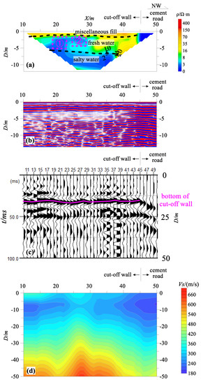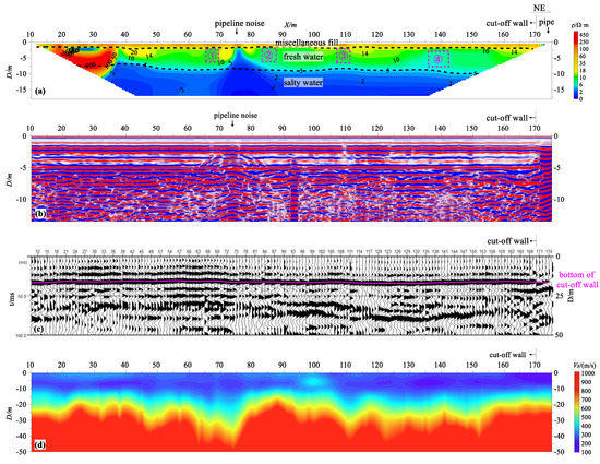 Figure 3a shows the resistivity profile of Line 1. As discussed in the previous section, information about the barrier wall in the saltwater layer was completely irretrievable. The time profile of the GPR in Figure 3b shows that a reflection wave with strong amplitude and horizontal straightness was detected at shallow depths above 5 m, and reflection characteristics, including weak amplitude and poor lateral continuity, were shown below 5 m. The depth of the barrier wall could not be determined from the radar time profile, and it was more difficult to assess the local defects in the barrier wall. However, GPR could effectively identify the underground metal pipelines. Therefore, GPR could be used for the investigation of hidden disturbances in the site in the detection of the barrier wall. Figure 3c shows the seismic image section of Line 1. There was a relatively obvious phase axis near 32 ms in the section. This phase axis had strong reflection energy, gentle fluctuations in the longitudinal direction, good continuity in the lateral direction, and no wrong break phenomenon. However, near point 170, there was a phenomenon of dislocation and discontinuity of the phase axis, which was completely consistent with the turning position of the barrier wall. After the time–depth conversion of the wave speed data, the depth corresponding to the position of the phase axis was determined to be about 16 m, which is consistent with the bottom boundary depth of the barrier wall. Therefore, it can be inferred that this phase axis reflected the bottom boundary of the barrier wall, which was horizontally flat, continuous, and clear, indicating the good quality of the barrier wall. Figure 3d shows the shear wave velocity profile of Line 1 as measured using the active source surface wave method. The lateral extension of each velocity layer in the profile was relatively gentle, and only the low-velocity layer bulged out to the deep part near point 75. It was verified via an on-site investigation that this was a disturbance caused by the pipeline.
