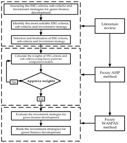 Several recent studies have used various MCDM methods [27,28,29,30,31] to evaluate the performance and strategies for green finance development in multiple sectors. The authors identified that green finance is essential to determine ESG criteria and investment strategies for sustainable development. These studies also suggested that MCDM methods can help evaluate ESG criteria and develop sustainable investment strategies. Since investors increasingly use ESG criteria to assess the sustainability and long-term viability of companies and projects, ESG criteria are critical components of green finance, and various investment strategies have been identified as effective ways to support sustainable and responsible investing. Investing in companies and projects promoting environmental sustainability, social justice, and transparent and responsible business practices can support the transition toward a more sustainable economy.