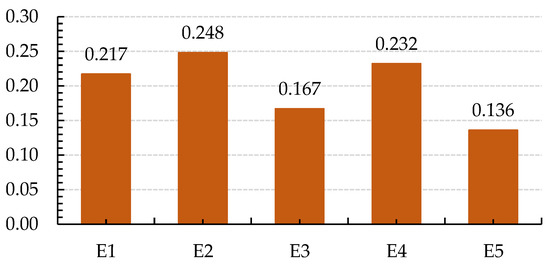 Figure 2 shows the ranking of sub-criteria with respect to environmental criteria (E). These results indicate the relative importance of each sub-criterion within each main set of criteria. Within the environmental criteria (E), climate change mitigation (E2) was considered an essential sub-criterion, while environmental impact assessment (E5) was regarded as the least important.