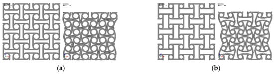 This study analyzed the mechanical metamaterials mainly characterized by the value of the Poisson’s ratio. Poisson’s ratio expresses the ratio of the deformation in the normal direction to the other orthogonal directions. Depending on how this relative deformation occurs, we can speak of natural materials or materials with auxetic character in which Poisson’s ratio has negative values [10,11]. Owing to their counterintuitive deformation characteristics, the auxetic materials [12] present numerous extraordinary mechanical properties like energy absorption [13], plane-strain fracture toughness [14], fracture resistance [15], indentation resistance [16], impact resistance [17], hardness, shear resistance [18], blast resistance and other excellent properties, and potential to form synclastic curvatures under out-of-plane bending [19,20,21]. The mechanical performance of the cellular structures depends on the loading direction, and these cellular structures are usually anisotropic [22]. Because of these exceptional characteristics established for auxetic structures [6], applications can be fulfilled in a wide range of applications: aerospace, mechanical engineering [23,24,25,26,27], medical application [28,29], acoustic engineering [30,31], seismic engineering [32,33], smart sensors [34,35], tubular structures [36,37,38,39], defense [40,41], sports [42], textile industry [43], smart filters, and protective engineering [6,23,44,45,46]. The performance of the negative Poisson’s ratio is given by the shape and geometrical arrangement of the basic units: re-entrant, with the unit defined by an irregular polygon with an interior angle greater than [23,24], chiral, with the unit comprised of a central cylinder with tangentially attached ligaments [47,48], and rotating polygonal models, which use a complex unit formed of square and equilateral triangular shapes connected by hinges at their vertices [49].