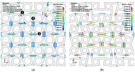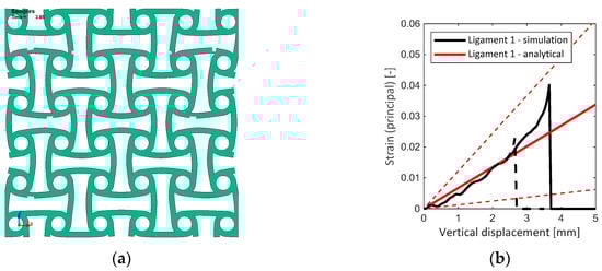 To develop the entire theoretical plateau, the ligaments connecting the nodes should not fail; thus, an investigation of the strains recorded in the ligaments is required.