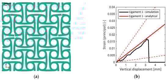 Strain analysis [79] can be applied for the determination of the ultimate load that can be applied to a structure prior to failure (or densification). Using the nodal displacement defined by Equation (16), the nodal rotation is determined: