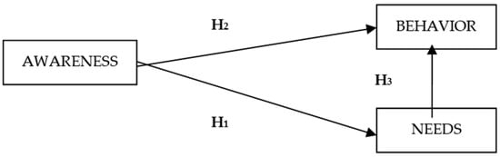 To measure the student’s behavior, needs and awareness of plastic waste, a Likert-scale type questionnaire, ranging from 1 ‘Totally Appropriate’ to 5 ‘Not at all appropriate’, was applied. The research model is given in Figure 1; we took into consideration: N—Needs; A—awareness about environment and plastic, and B—Behavior.