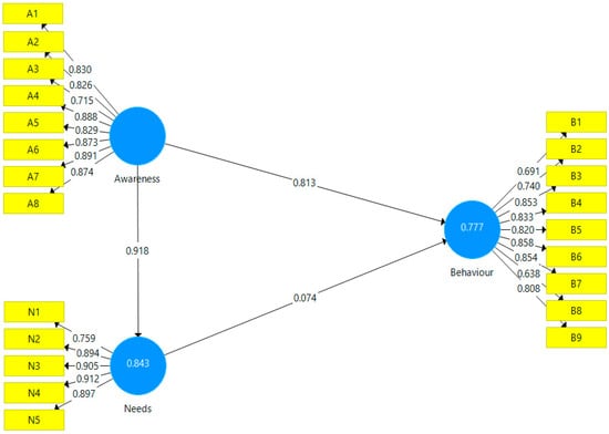 The fact that each of the factor loads is greater than 0.708 indicates that the reliability of the indicator is provided. If the loads are below 0.70, it is recommended to examine the composite reliability value when the item is removed, instead of removing the items [59]. If factor loading are lower than 0.40, it is recommended to remove items from reflective scales.