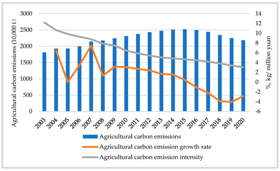 34]. The biggest drop was observed in 2019 (4.067%). Agricultural carbon emission intensity (measured by the ratio of agricultural carbon emissions to agricultural output value per million Yuan) has been on a downward trend, decreasing from 12.191kg/million Yuan of agricultural output value in 2003 to 3.049kg/million Yuan of agricultural output value in 2020. China has made some advances in agricultural carbon emission reduction in recent years.