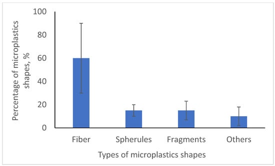 According to Pico et al. [22], Riyadh is a prominent economic, commercial, and production industry hub, covering a population of about 7.6 million residents, with many manufacturing companies generating polymer products that are capable of utilizing a great number of plastics. On the other hand, Al-Jubail is also one of the biggest petrochemical production regions that produce polymer resins and synthetic materials [22]. A study based on these two cities was conducted by obtaining surface water specimens. The mean concentrations of microplastics in Riyadh and Al-Jubail were 3.2 ± 0.2 items per liter and 0.2 ± 0.1 items per liter, respectively [22]. These mean results indicate that these towns have been contaminated with microplastics. Based on Figure 1, fibers are highly distinguished, accounting for 60% of the total microplastics extracted from the specimens (with only 1% lesser fiber found in Riyadh), subsequently fragment-shaped and spherules microplastics account for 15% each, and the remaining percentage consists of other kinds of minor shapes [22]. Most of the micro debris extracted was between 50 µm and 1000 µm, with the highest percentage of 35% in the group ranging from 50 µm to 100 µm, followed by 25% in the group ranging from 100 µm to 250 µm [22].