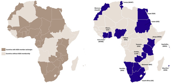 (left) African Securities Exchanges Association (ASEA) member exchanges, adapted from Raubenheimer [30], and (right) selected countries in the study.