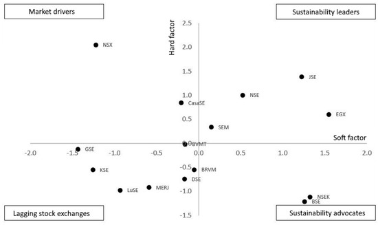 The process of EFA assessed the sets of six measures, based on the 22 variables, by transforming the two underlying latent factors (i.e., soft and hard) by way of the linear interrelationships via the output measures. Each factor is determined by the relation pattern between measures and dominated by variables with high loads. The factors identify a structure of variability and show the relationship among the variables, identifying any underlying commonalities across the sample of observed African exchanges. The obtained raw factors in EFA were rotated using an orthogonal method called varimax rotation, i.e., an algorithm to determine the dimensions of the factors where one variable loads highly on one particular factor but loads less on the other [90]. As a result, the final result simplifies the interpretation of factors, where one factor has high loadings on some variables and low on others. The soft factor is determined by the following measures with the highest loads: PART, COM, and GUID. These measures describe soft, indirect sustainability support provided by the given stock exchanges. Contrarywise, the hard factor is defined by CAP, LIST, and MARK and supports hard, direct measures in favor of sustainability measures. In short, utilizing EFA aided in the robustness of performance measures and overall study checks. The soft factor explains 44.1% complete volatility of all six measures, while the hard factor explains 34%. Both factors determine 78.1% of the whole variability (Table 7). Due to the large values of the specified soft factor and hard factor, a further analysis was performed. The values of factor loadings for both factors were used to classify the analyzed exchanges (Figure 2).