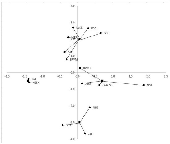 After a thorough analysis of the EFA classification results, two of the exchanges show proximity to both axes (i.e., SEM in the leading group and BVMT in the second lagging group). Due to an analysis of the qualitative measures, it was decided to verify the results using a different classification process, i.e., a robustness check. A non-hierarchical k-means analysis (i.e., developed by MacQueen [91] in 1967) with four clusters (i.e., K = 4) determined a priori with stock exchanges classified to the clusters based upon the smallest distance to the cluster mean [92] (Figure 3). JSE, NSE, and EGX were classified together in the leading group, but the SEM outlier migrated. Clustering outputs were examined for two, three, and four groups, and in every case, those three leading exchanges stayed together while the rest migrated depending on the cluster obtained. A potential explanation for the difference in the grouping of SEM and BVMT under the EFA and k-means method may arise from the fact that each classification is an image of reality, and the results obtained depend on the algorithm used.