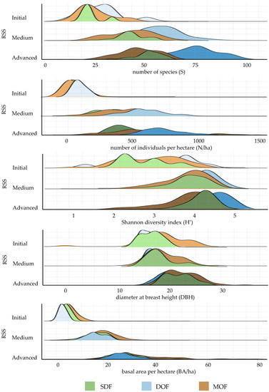 The number of species (S) in DOF (69 ± 16) was statistically higher (p < 0.001) than MOF (38 ± 15) and SDF (44 ± 9) at the same regeneration stage. (Henceforth, the notation M ± D stands for the median ± IQR range) in the advanced stage). However, for such indicators, there was no significant difference between the SDF and the MOF, as can be seen in Figure 3.