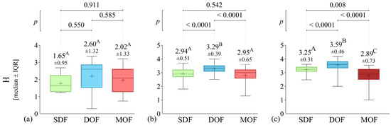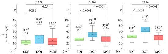 Normality and homoscedasticity assumptions were checked using the Shapiro–Wilks and Levene tests, which were rejected at a 5% significance level. Consequently, non-parametric tests were employed for statistical analysis. To compare the DOF, MOF, and SDF ecosystems based on the key indicators, the Kruskal–Wallis test was used, followed by pairwise multiple comparisons in independent groups, employing Dunn’s procedure.