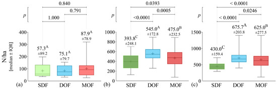 Comparison among Atlantic Forest ecosystems (SDF, DOF, and MOF) in relation to the individuals per hectare (N/ha): (a) initial, (b) medium, and (c) advanced stage. The values with different superscript letters (A, B or C) are significantly different (p < 0.05).