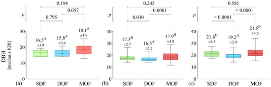Comparison among Atlantic Forest ecosystems (SDF, DOF, and MOF) in relation to the diameter at breast height (DBH): (a) initial, (b) medium, and (c) advanced stages. The values with different superscript letters (A or B) are significantly different (p < 0.05).