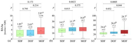 Comparison among Atlantic Forest ecosystems (SDF, DOF, and MOF) in relation to the basal area per hectare (BA/ha): (a) initial, (b) medium, and (c) advanced stage. The values with different superscript letters (A, B or C) are significantly different (p < 0.05).