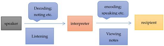 Listening capacity is the first key stage for interpreters, since processing speech information requires several steps, including input, decoding, and transferring into note tokens in the brain [6], which is the traditional consecutive interpreting module. Multi-tasking incurs the loss of some input, the lack of time to interpret certain terminology, or the length of time to convert the message from acoustic input to notes [7], which all lead to the decline of the overall interpreting performance. The traditional consecutive interpreting model stipulates that interpreters decode the listening input while converting the information into note symbols and inputting those symbols into an order system, etc. Moreover, interpreters have to view the notes they write down and process them into logical spoken discourse (encoding in language utterance) simultaneously so as to deliver the accurate message to a certain recipient. This process is demonstrated in Figure 1: