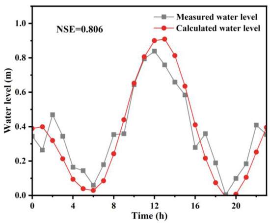 The NSE coefficient ranges from minus infinity to 1. An NSE value close to 1 indicates that the simulated value is highly consistent with the measured value, confirming that the simulation is preferable. An NSE coefficient between 0.5 and 0.6 suggests that the quality of the model is fully reliable [29,30]. If the NSE coefficient is between 0.65 and 0.86, the quality of the model is close to perfection [31,32]. In our research, the NSE coefficient was considered to evaluate the adaptation degree between the predicted and measured data on the water level. According to the NSE coefficient results, the model was optimized until the predicted value fit the measured value well. The data from Xihe River on 9 September 2018 were used for hydraulic model calibration. The NSE coefficient of the water level was 0.806, confirming that the hydraulic model can be used for further analysis (Figure 2).