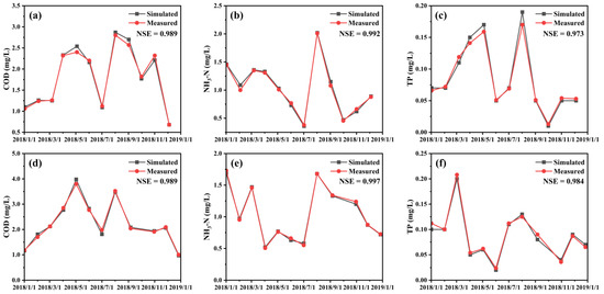 Comparison of simulated and measured data on COD, NH3-N, and TP in the Donghe River (a–c) and Xihe River (d–f), respectively.