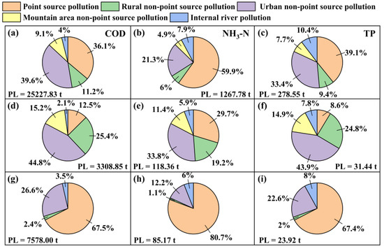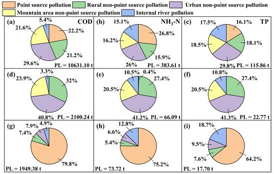 The contribution proportion of each pollution source in the total pollution (a–c), Tangtashui River (d–f), and Donghe River (g–i) corresponding to different pollutants after the scheme was applied (PL means pollution load).