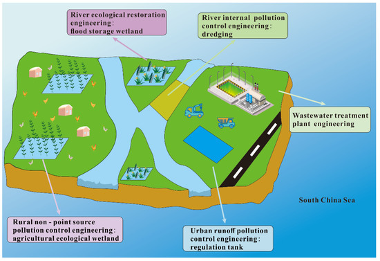 In order to solve the problem of substandard water quality in the Sanya River Basin, a series of water quality improvement projects were designed, including an urban runoff pollution control project, a rural non-point source pollution control project, a sewage treatment plant project, an internal river pollution control project, and a river ecological restoration project (Figure 5). To control the initial urban rain runoff pollution and the direct discharge of sewage in the dry season, 13 regulation tanks were added (Table S7). In addition, six agricultural ecological wetlands were set up in the program to control rural non-point source pollution (Table S8). There are two sewage treatment plants in the Sanya River Basin. In order to realize source control and sewage interception, a new sewage treatment plant was added to improve the regional sewage treatment capacity. As the designed capacity is 50,000 t/d, the new sewage treatment plant collects and treats domestic sewage from the Baopo and Luobidong areas, Banlingshui Hot Spring, and the surrounding villages. The sewage treatment plant is entirely underground, and its effluent quality meets the Class IV standard for surface water (GB 3838-2002) [33]. From the pollution status quo, compared with non-point source pollution and point source pollution, the proportion of internal river pollution in the total pollution load is minimal. It can be investigated as to whether this scheme effectively controls non-point source pollution and point source pollution. If not, internal river pollution would be the primary source of pollution. Therefore, the scheme could be used to dredge the urban rivers (i.e., the downstream sections of the Xihe River and Donghe River). To solve the problem of large amounts of water coming from the upstream mountainous areas and limited central drainage capacity, flood storage wetlands were set up to alleviate drainage pressure and realize regional flood control (Table S9). This scheme was carried out in InfoWorks ICM, and the effect of the comprehensive treatment engineering in Section 3.3 refers to the simulated results.