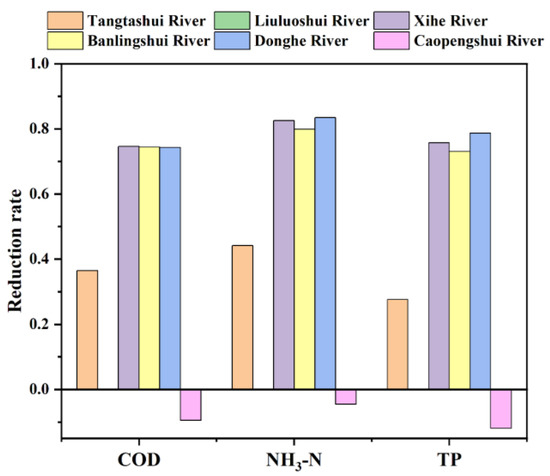 The reduction rates of the three pollutants were calculated for each control unit (Figure 7 and Table S11). The Liuluo River Basin is a vital water source protection area and features a reservoir with Class I or II water quality, as defined by the GB 3838-2002. Given this favorable water quality status, no additional pollution control measures are necessary for the Liuluo River Basin. Therefore, the default pollutants remained unchanged. With the construction of a 50,000 t/d sewage treatment plant in the Caopengshui River, point source pollution was more severe than before the treatment was implemented. However, except for the Liuluoshui River and Caopengshui River, the point source pollution of other control units was effectively controlled.