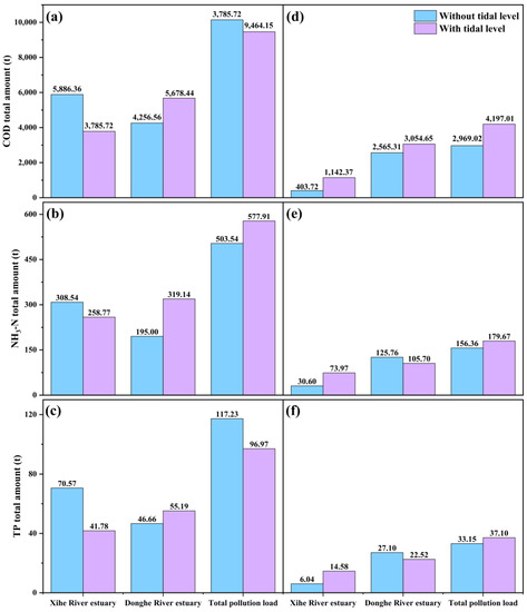 The total amount of pollutants at the estuary of the Xihe River and Donghe River (with or without tidal level) before (a–c) and after (d–f) the scheme’s implementation.