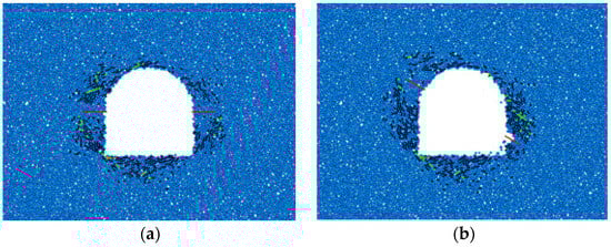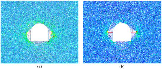 Figure 9 shows the distribution of mesocracks in the surrounding rock of the tunnel under different fracture lengths. In the figure, the black line represents the mesoscopic compression shear crack, the green line represents the mesoscopic tensile crack, and the mesocracks are mainly distributed around the tunnel structure. The initiation, expansion, accumulation, and intersection of cracks cause the deterioration of the surrounding rock structure and the weakening of mechanical properties. In the process of stress redistribution, due to the normal unloading of the excavation face, the tangential stress concentration of the surrounding rock is caused, and the compression-shear crack propagation occurs in the direction parallel to the excavation face, leading to the compression-shear failure of the surrounding rock. After the transient unloading of the deep-buried tunnel, the surrounding rock is mainly subjected to compression-shear failure, corresponding to the dominant black shear cracks in the figure. The shear cracks of the complete surrounding rock are concentrated near the bottom plate and two sides, while a small number of tensile cracks are distributed at the left and right bottom corners. The distribution of mesocracks in the surrounding rock varies greatly under different fracture lengths. When the fracture length is small, the distribution of mesocracks is relatively dense and mainly concentrated in the bottom plate, two sides, and arch shoulders. When the fracture length is large, the fracture distribution is sparse, but the extension range is large. There is a small amount of fracture accumulation near the bottom plate and vault. The fractures are scattered on the two sides and extend to the initial fracture tip. It can be seen that with the increase in the fracture length, the distance from the stress concentration point at the fracture tip to the free surface gradually increases, and the damage range of the surrounding rock continues to expand. The distribution of mesocracks on the two sides of the tunnel gradually becomes sparse, the extended area gradually becomes larger, and the damaged area of surrounding rock gradually migrates to the deep area.