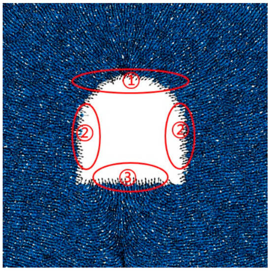 In the process of tunnel excavation, the displacement of surrounding rock directly affects the fragmentation degree of the tunnel structure and is also an important indicator to measure the stability of the surrounding rock. The displacement changes in the surrounding rock under transient unloading with different fracture lengths are almost the same. Taking the numerical model of a 6 m fracture length as an example, the displacement direction in the surrounding rock is shown in Figure 6. It can be seen that the self-adjustment of fractured surrounding rock is mainly reflected in three aspects: ① the surrounding rock at the vault shows a sinking trend, but the surrounding rocks at the arch shoulder tend to squeeze toward the center while moving in opposite directions, forming the “arching” effect, thus improving the bearing capacity of the vault. ② The surrounding rocks at the two sides and the left and right bottom corners show the trend of opposite movement, so that the stress of the whole tunnel structure tends to be balanced, and large deformation and damage can be avoided locally. ③ The surrounding rocks at the bottom plate of the arch are squeezing each other, showing an upward trend.