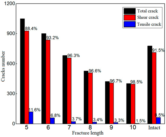 When the surrounding rock is damaged and destroyed, the tensile and shear cracks represent different failure mechanisms. The statistical data on the number of mesocracks are shown in Table 3. According to the data in the table, the number of fractures and the proportion of each fracture under different fracture lengths are compared and analyzed, as shown in Figure 10. Under different fracture lengths, the total number of mesocracks and the proportion of tensile and shear cracks are different. When the fracture length is small (5 m and 6 m), the total number of mesocracks in the fractured surrounding rock is more than that in the complete surrounding rock, while the total number of mesocracks in the surrounding rock under other fracture lengths is lower than that in the complete surrounding rock. When the fracture length is 5 m, the proportion of shear cracks is 88.4%, which is lower than 91.5% of shear cracks in the complete surrounding rock, and the proportions of shear cracks under other fracture lengths are higher than those in the complete surrounding rock. On the whole, with the increase in the fracture length, the total number of mesocracks shows a monotonic decreasing trend, from 1048 to 403, with a decrease of up to 62%. The proportion of shear cracks increases monotonically with the fracture length, from the lowest value of 88.4% to the highest value of 98.5%, with an increase of 11.4%.