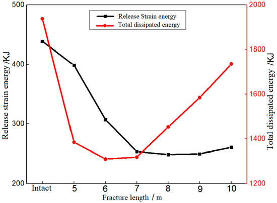 Energy conversion is the essential feature of various physical changes. In the process of transient unloading of deep-buried tunnel, the damage and deformation of the surrounding rock is also the result of energy release and transformation. The PFC discrete element analysis method can track the change in energy storage and release during the simulation process. Through monitoring the total energy and elastic strain energy in the whole model system, the released amount of strain energy caused by tunnel transient unloading and the total amount of dissipation energy in the whole process can be calculated. The energy conversion law is shown in Figure 11. The release amount of strain energy and the total amount of dissipation energy during the transient unloading of surrounding rock with different fracture lengths are less than the energy value of the complete surrounding rock. The release amount of strain energy is the largest when the fracture length is 5 m, which can reach 91% of the integral surrounding rock. When the fracture is 10 m-long, the total amount of dissipation energy is largest, accounting for 90% of the complete surrounding rock. The existence of fractures destroys the integrity of rock mass and releases some elastic strain energy to a certain extent. Tunnel excavation has a certain influence range, and with the increase in the fracture length, the influence will gradually weaken and tend to disappear, namely, the energy released is closely related to the tunnel size. The released strain energy decreases first and then tends to be stable. With the increase in the fracture length, the total amount of dissipation energy decreases first and then increases. The damaged area also migrates from the surrounding area of the tunnel to the deep part of the rock mass.