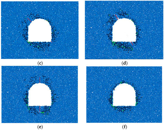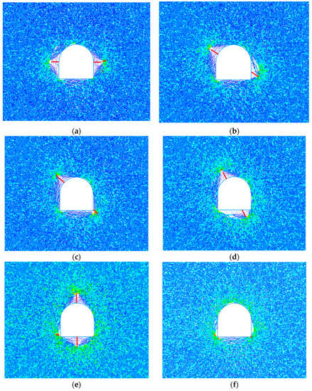 Distribution of mesocracks in the tunnel-surrounding rock under different fracture lengths. (a) 5 m; (b) 6 m; (c) 7 m; (d) 8 m; (e) 9 m; (f) 10 m.