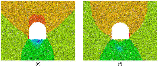 Figure 5 shows the stress distribution and stress partition map under different fracture lengths after 50,000 steps of the excavation cycle. Under the condition of the complete surrounding rock, there is an obvious stress concentration at the left and right bottom corners, arch shoulders, and vaults of the tunnel, and the stress distribution at the tunnel excavation boundary is dense. The maximum stress appears at the bottom corners of the tunnel, and the tunnel-surrounding rock is severely damaged. In the fractured rock mass, the stress is not concentrated at the excavation surrounding the rock boundary but mainly distributed at the initial fracture tip. With the increase in the fracture length, the distance between the part with a large stress concentration and the tunnel boundary gradually increases, the stress distribution around the tunnel is gradually sparse, and the stress accumulation at the left and right bottom corners and the vault is continuously reduced. It can be seen that the fractures have an important impact on the stress adjustment process of the transient unloading of the deep-buried tunnel, and the existence of the fractures changes the stress adjustment areas after tunnel excavation.