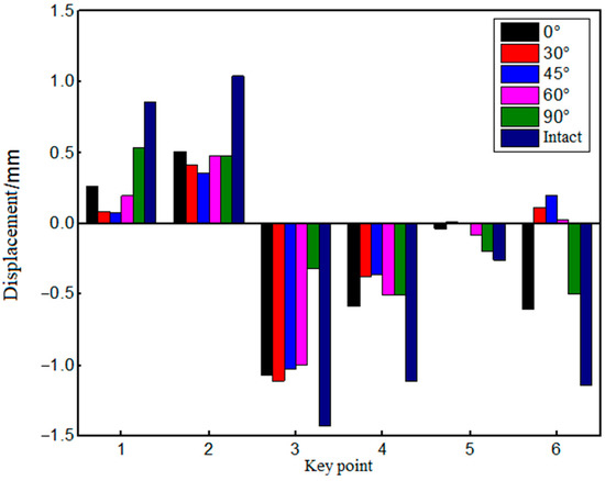 The displacements of key points at different fracture angles are shown in Figure 14. It can be seen from the figure that the displacement of each key point of the fractured surrounding rock is less than that of the complete surrounding rock. At the No. 3 key point, the displacement of 30° fractured surrounding rock reaches the maximum value of 1.11 mm, which is 22.4% lower than that of the complete surrounding rock. Under the same fracture angle, the displacement of surrounding rock at each key point is quite different. The maximum displacement of 0°, 30°, 45°, and 60° fractured surrounding rocks occurs at the No. 3 point, while the maximum displacement of the 90° fractured surrounding rock occurs at the No. 1 point. This is because the 90° fracture vertically penetrates the vault, which has a great impact on the surrounding rock structure above the vault, resulting in insignificant deformation at the tunnel vault. With the increase in the fracture angle, the displacements of the surrounding rock at key points 1, 2, 4, and 5 show a trend of first decreasing and then increasing. The displacement of surrounding rock at the No. 3 key point increases first and then decreases. The displacement direction of the surrounding rock at the No. 6 key point is changed. The displacements in the 0° and 90° fractured surrounding rocks are downward, and the displacements in other angles are upward, indicating that the “arching” effect of the tunnel bottom plate is obvious under the influence of oblique fractures. At the No. 2, 4, and 6 key points, the displacement of the 0° fractured surrounding rock reaches the maximum. At the No. 1 and 5 key points, the displacement of the 90° fractured surrounding rock reaches the maximum. At the No. 3 key point, the maximum displacement of the surrounding rock occurs in the 30° fractured surrounding rock. At the No. 5 key point, the displacement of the surrounding rock is always the minimum.