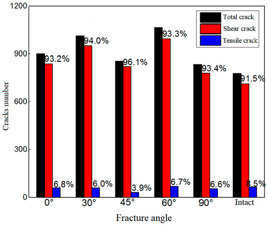 The statistics on the number of mesocracks in the damage process of the tunnel-surrounding rock under different fracture angles are shown in Table 4. According to the data in the table, the number of shear cracks is far more than that of tensile cracks, indicating that the surrounding rock is mostly damaged by compression and shear during the transient unloading process of the tunnel. The total number and proportion of fractures are compared and analyzed, as shown in Figure 16. The total number of mesocracks and the number of shear cracks in the surrounding rock under different fracture angles are more than those in the complete surrounding rock. The total number of mesocracks in the 60° fractured surrounding rock reaches the maximum value of 1066 mesocracks, which is nearly 37% higher than that in the complete surrounding rock and about 28% higher than the minimum value of 835 mesocracks in the 90° fractured surrounding rock. Under different fracture angles, the number of mesocracks varies greatly. The total number of mesocracks in the 60° and 30° fractured surrounding rocks is greater, followed by the 0° fractured surrounding rock, and the total number of mesocracks in the 45° and 90° fractured surrounding rocks is relatively less. The proportion of compression-shear cracks shows a trend of increasing first and then decreasing with the increase in the fracture angle. However, the number of mesocracks in the fractured surrounding rocks is consistently higher than that in the complete surrounding rock. Under the 45° fractured surrounding rock, the proportion of compression-shear cracks reaches the maximum of 96.1%.