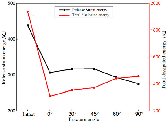 When the deep-buried tunnel is under transient unloading, the elastic strain energy stored in the surrounding rock is suddenly and rapidly released, resulting in structural damage to the surrounding rock [29,30,31,32]. The expansion of the primary fracture and the germination of the new fracture will produce a large amount of dissipation energy. The release amount of strain energy and the total amount of dissipation energy in the system caused by transient unloading are monitored by the program, and their change rules under different fracture inclination angles are compared and analyzed as shown in Figure 17. It can be seen that the released amount of strain energy and the total amount of dissipation energy during the excavation of the surrounding rock at different fracture angles are lower than those in the integral surrounding rock. The maximum value of the released amount of strain energy in the fractured surrounding rock is 27.6% lower than that in the integral surrounding rock, and the maximum value of the total amount of dissipation energy is about 24.8% lower than that in the complete surrounding rock. The released amount of strain energy first increases slowly and then decreases rapidly with the increase in the fracture angle, and it reaches the maximum value in the 45° fractured surrounding rock. The total amount of dissipation energy increases monotonically with the increase in the fracture angle. Its variation characteristics are likely closely related to the shape of the tunnel.