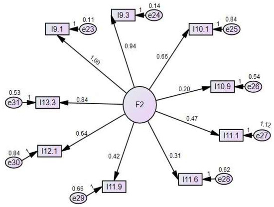 In Figure 2, it can be observed that the items that relate most closely to the teacher-centered approach model are 9.1 (teaching knowledge), 9.3 (teaching multicausality and the consequences of facts) and 13.3 (evaluating by means of a final written test). According to the participants’ answers, the items that relate least to the model are 10.9 (autonomous and individual learning) and 11.6 (guided visits to museums, archaeological sites, etc.). In factor 2, the Average Variance Extracted (AVE) is 0.440 and the Composite Reliability (CR) is 0.85.