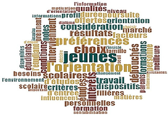 We ran a word frequency query to find out which were the most frequent in the interviews collected, and we noticed that the terms “young people”, “orientation”, “choice”, “job market”, “competence”, and “training” were the most mentioned. We deduced that it was about the young people’s orientation and the choice of discipline and training.