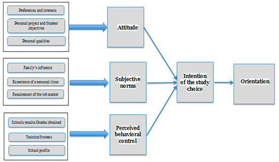 By making the connection between our results and the TCP theory, we can conclude “a behavioral model of orientation” (Figure 5), which proposes that the attitudes to have the intention to make a choice of study is explained by multiple variables, including the personal project/goals, preferences, interests, and personal qualities.