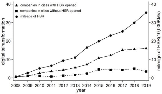 New economic geography theory points out that changes in companies’ geographic environment can have an important impact on their decision making. The vast territory of China and the great geographical distances between different regions make the development of transportation infrastructure profoundly intrinsic and connected to corporate decision making. In particular, since China entered the era of high-speed rail, the HSR’s impact of the “time-space compression” effect on corporate decision making has become the focus of scholars. Specifically, the existing literature has investigated the effects of opening an HSR on firm innovation [9,10], corporate relocation [11,12], financial performance [13,14], and corporate financialization [15]. However, there is no literature directly focusing on the relationship between opening an HSR and corporate digital transformations, and the relationship between the two can only be indirectly speculated from the existing literature. For example, the opening of an HSR has broken the spatial–temporal constraint of geographical distance and enhanced intercity accessibility, which removed obstacles to the cross-regional movement of production factors [16] and promoted the concentration of capital, technology, talent, and information [11,17,18,19]. In this regard, opening an HSR can alleviate the problems of “won’t transform” due to a high technological threshold, “do not want to transform” due to high resource investments, and “afraid to transform” due to the uncertainty of the transformation results. Furthermore, Figure 1 also provides us with intuitive evidence that the degree of digital transformation is generally higher in enterprises with access to HSR services compared with those without access to HSR services, and the degree of digital transformation tends to follow the HSR’s growth, which indicates that there may be a positive correlation between the two. Therefore, to directly examine the relationship between the opening of an HSR and corporate digital transformations, we set to answer the following research questions from a theoretical perspective: (1) Does the opening of an HSR affect corporate digital transformation? (2) What is the mechanism between the two? (3) Does the impact of opening an HSR on corporate digital transformation vary with the change in the external environment? The answers to the above questions not only provide direct evidence for the relationship between the opening of an HSR and corporate digital transformations, but they also provide useful references to guide enterprises to successfully implement corporate digital transformations to enhance their core competitiveness.