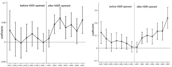 where Hsr_mi,t and Hsrni,t are the advance term and lag term of the HSR opening, respectively. ηm is used to verify whether the parallel trend hypothesis is met before opening the HSR. If it is not significant, then it is met; otherwise, it can be questioned that the change in corporate digital transformations was not caused by the opening of the HSR.