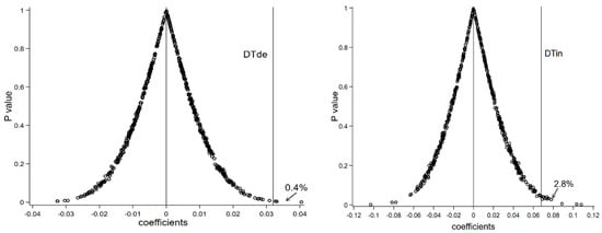 To exclude the impact of the omitted variables on the estimation results, we also conducted a placebo test. Specifically, we randomly selected some samples and randomly generated a fake open time for them so that we could construct a random treated group and rerun the regression. We repeated the regression 500 times, and the results are mapped in Figure 3. The coefficients of the randomly generated independent variable Hsr_r were centrally distributed at 0 for both the DTde and Dtin. There was only a 0.4% and 0.8% possibility that the estimated coefficients in the benchmark regression were in the distribution of the fake estimated coefficients for the DTde and DTin, respectively. The results suggest that after controlling the abovementioned problems, the basic conclusion still held.