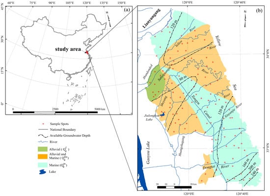 Distribution of sampling points and regional geological conditions. (a) The study area is located in eastern central China; (b) Distribution of sampling points on a hydrogeological map (including the major water networks, available groundwater depth, and geological composition).